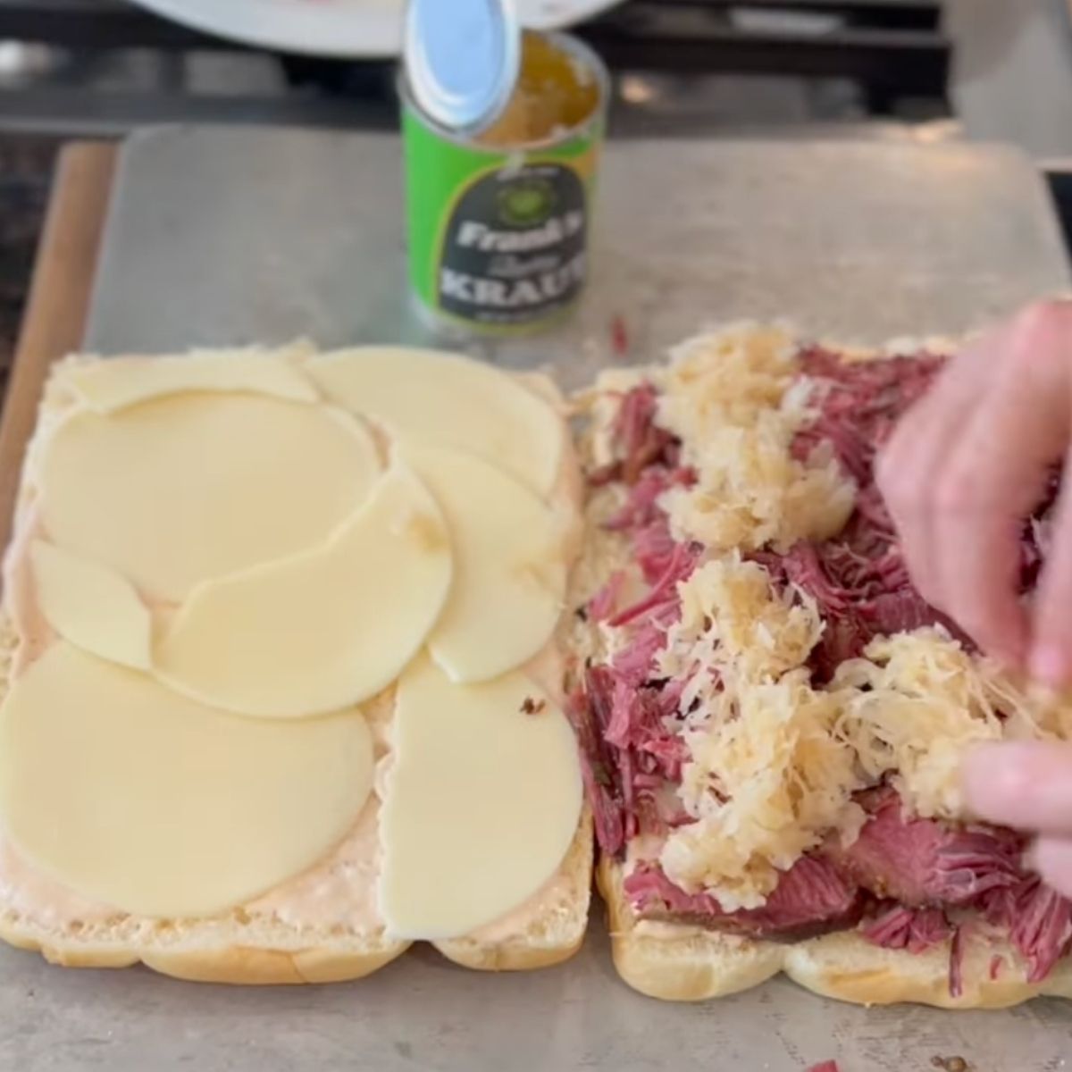 - On the bottom bun, add a layer of cheese, sauce, corned beef, the sauerkraut (you may not use the entire can), another layer of sauce if desired, and a another layer of cheese.